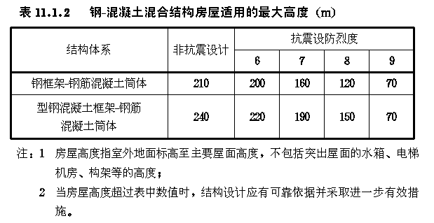 11.1.1 本章所称混合结构系指由钢框架或型钢混凝土框架与钢筋混凝土筒体所组成的共同承受竖向和水平作用的高层建筑结构。 11.1.2 混合结构高层建筑适用的最大高度宜符合 表11.1.2 的要求。 11.1.3 混合结构高层建筑的高宽比不宜大于 表11.1.3 的规定。