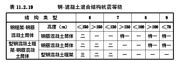 11.2.19 钢/混凝土混合结构房屋抗震设计时,钢筋混凝土筒体及型钢混凝土框架的抗震等级应按 表11.2.19 确定,并应符合相应的计算和构造措施。