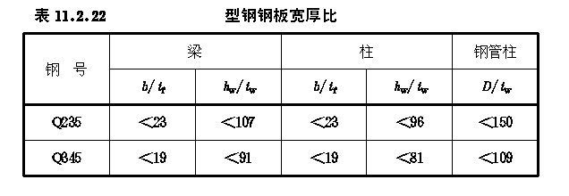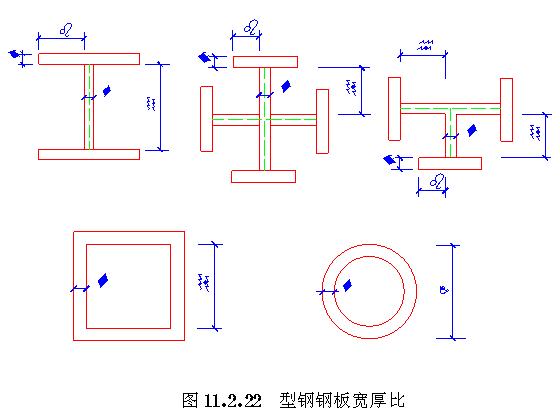 11.2.22 型钢混凝土构件中,型钢钢板的宽厚比满足 表11.2.22 的要求时,可不进行局部稳定验算( 图11.2.22 )。 |