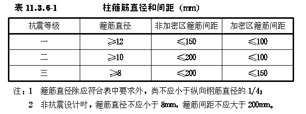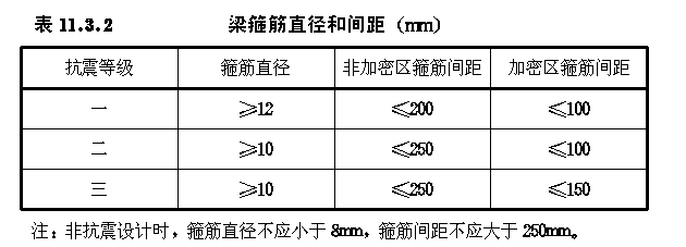 2梁箍筋的直径和间距应符合 表11.3.2 的要求,且箍筋间\距不应大于梁截面高度的1/2。抗震设计时,梁端箍筋应加密,箍筋加密区范围,一级时取梁截面高度的2.0倍,二、三级时取梁截面高度的1.5倍;当梁净跨小于梁截面高度的4倍时,梁全跨箍筋应加密设置。