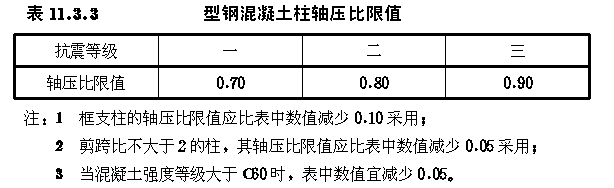 11.3.3 当考虑地震作用组合时,钢/混凝土混合结构中型钢混凝土柱的轴压比不宜大于 表11.3.3 的限值。