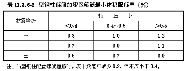 4柱型钢含钢率,当轴压比大于0.4时,不宜小于4%,当轴压比小于0.4时,不宜小于3%;