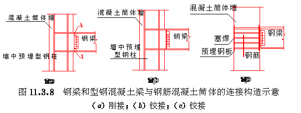11.3.8 钢梁或型钢混凝土梁与钢筋混凝土筒体应可靠连接,应能传递竖向剪力及水平力;当钢梁通过埋件与钢筋混凝土筒体连接时,预埋件应有足够的锚固长度。连接做法可按 图11.3.8 采用。