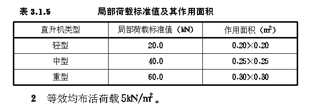 1直升机总重量引起的局部荷载,按由实际最大起飞重量决定的局部荷载标准值乘以动力系数确定。对具有液压轮胎起落架的直升机,动力系数可取1.4;当没有机型技术资料时,局部荷载标准值及其作用面积可根据直升机类型按 表3.1.5 取用;