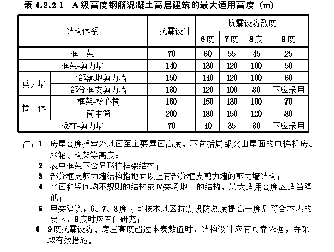 4.2.1 钢筋混凝土高层建筑结构的最大适用高度和高宽比应分为A级和B级。B级高度高层建筑结构的最大适用高度和高宽比可较A级适当放宽,其结构抗震等级、有关的计算和构造措施应相应加严,并应符合本规程有关条文的规定。 4.2.2 A级高度钢筋混凝土乙类和丙类高层建筑的最大适用高度应符合表4.2.2/1的规定,具有较多短肢剪力墙的剪力墙结构的最大适用高度尚应符合本规程第7.1.2条的规定。框架/剪力墙、剪力墙和筒体结构高层建筑,其高度超过 表4.2.2-1 规定时为B级高度高层建筑。B级高度钢筋混凝土乙类和丙类高层建筑的最大适用高度应符合 表4.2.2-2 的规定。