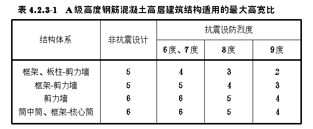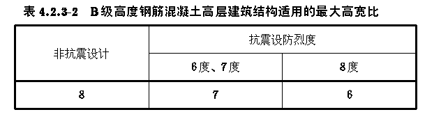 4.2.3 A级高度钢筋混凝土高层建筑结构的高宽比不宜超过 表4.2.3-1 的数值;B级高度钢筋混凝土高层建筑结构的高宽比不宜超过表4 .2.3-2 的数值。