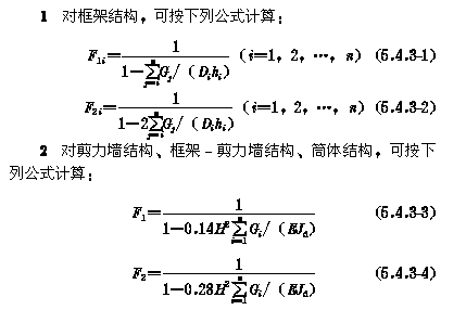 5.4.3 高层建筑结构重力二阶效应,可采用弹性方法进行计算,也可采用对未考虑重力二阶效应的计算结果乘以增大系数的方法近似考虑。结构位移增大系数F 1 、F 1i 以及结构构件弯矩和剪力增大系数F 2 、F 2i 可分别按下列规定近似计算,位移计算结果仍应满足本规程第4.6.3条的规定. 公式