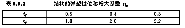 η p ———弹塑性位移增大系数,当薄弱层(部位)的屈服强度系数不小于相邻层(部位)该系数平均值的0.8时,可按表5.5.3采用;当不大于该平均值的0.5时,可按表内相应数值的1.5倍采用;其他情况可采用内插法取值;