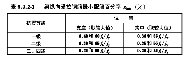 2纵向受拉钢筋的最小配筋百分率ρ min (%),非抗震设计时,不应小于0.2和45f t /f y 二者的较大值;抗震设计时,不应小于 表6.3.2-1 规定的数值;