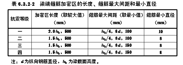 5抗震设计时,梁端箍筋的加密区长度、箍筋最大间距和最小直径应符合 表6.3.2-2 的要求;当梁端纵向钢筋配筋率大于2%时,表中箍筋最小直径应增大2mm。