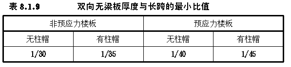 5双向无梁板厚度与长跨之比,不宜小于 表8.1.9 的规定。