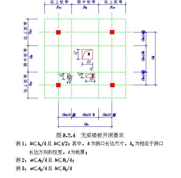 3无梁楼板允许开局部洞口,但应验算满足承载力及刚度要求。当未作专门分析时,在板的不同部位开单个洞的大小应符合 图8.2.4 的要求。若在同一部位开多个洞时,则在同一截面上各个洞宽之和不应大于该部位单个洞的允许宽度。所有洞边均应设置补强钢筋。 |