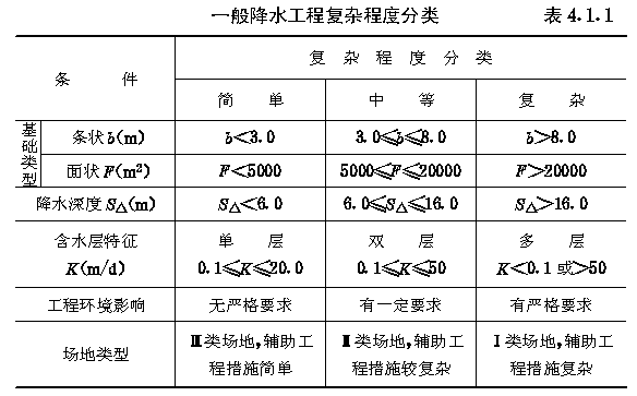 4.1.1 建筑与市政一般降水工程,应根据基础类型、基坑(槽)降水深度、含水层特征、工程环境及场地类型的复杂程度分类,按表4.1.1确定。