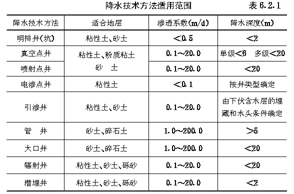 6.2.2 明排井(坑)应符合下列要求: 1适用条件: (1)不易产生流砂、流土、潜蚀、管涌、淘空、塌陷等现象的粘性土、砂土,碎石土的地层; (2)基坑或涵洞地下水位超出基础底板或洞底标高不大于2.0m。 2布置原则: (1)基坑周围或坑道边侧设置明排井、排水管沟,应与侧壁保持足够距离; (2)明排井、排水管沟不应影响基坑和涵洞施工。 6.2.3 点井降水应符合下列要求: 1适用条件: (1)粘土、粉质粘土、粉土的地层; (2)基坑(槽)边坡不稳,易产生流土、流砂、管涌等现象; (3)地下水位埋藏小于6.0m,宜用单级真空点井;当大于6.0m时,场地条件有限宜用喷射点井、接力点井;场地条件允许宜用多级点井; (4)基坑场地有限或在涵洞、水下降水的工程,根据需要可采用水平、倾斜点井降水方法。 2布置原则: (1)真空点井沿基坑周围布置成线状、封闭状。点井间距0.8~2.0m,距边坡线至少1.0m。采用水平点井时,点井布置在含水层的中下部;采用倾斜点井时,点井应穿过目的含水层;采用多级点井时,点井的基坑平台级差宜为4~5m; (2)喷射点井间距1.5~3.0m; (3)电渗点井管(阴极)应布置在钢筋或管制成的电极棒(阳极)外侧0.8~1.5m,露出地面0.2~0.3m; (4)接力点井的降水深度大于单级点井降水深度时,其点井间距可略大于单级点井间距,并应由试验确定。 6.2.4 引渗井降水应符合下列要求: 1适用条件: (1)当含水层的下层水位低于上层水位,上层含水层的重力水可通过钻孔引导渗入到下部含水层后,其混合水位满足降水要求时,可采用引渗自降; (2)通过井孔抽水,使上层含水层的水通过井孔引导渗入到下层含水层,使其水位满足降水要求时,可采用引渗抽降; (3)当采用引渗井降水时,应预防产生有害水质污染下部含水层。 2布置原则: (1)引渗井可在基坑内外布置,井间距根据引渗试验确定,井距宜为2.0~10.0m; (2)引渗井深度,宜揭穿被渗层,当厚度大时,揭进厚度不宜小于3.0m。 6.2.5 管井降水应符合下列要求: 1适用条件: (1)第四系含水层厚度大于5.0m; (2)基岩裂隙和岩溶含水层,厚度可小于5.0m; (3)含水层渗透系数K''值宜大于1.0m/d。 2布置原则: (1)降水管井应布置在基坑边线1.0m以外; (2)根据抽水试验的浸润曲线,当井间地下分水岭的水位,低于设计降水深度时,应反算井距和井数; (3)基坑范围较大时,允许在基坑内临设降水管井和观测孔,其井、孔口高度宜随基坑开挖而降低。 6.2.6 大口井降水应符合下列要求: 1适用条件: (1)第四系含水层,地下水补给丰富,渗透性强的砂土、碎石土; (2)地下水位埋藏深度在15.0m以内,且厚度大于3m的含水层。当大口井施工条件允许时,地下水位深度可大于15m; (3)布设管井受场地限制,机械化施工有困难。 2布置原则: (1)大口井井周距基坑边侧处应大于1.0m; (2)大口井可单独使用,亦可同引渗井、管井、辐射井组合使用; (3)特殊施工条件下,也可布置在基坑中心,采用潜埋井技术。 6.2.7 辐射井降水应符合下列要求 1适用条件: (1)降水范围较大或地面施工困难; (2)粘性土、砂土、砾砂地层; (3)降水深度4~20m。 2布置原则: (1)辐射井的布置,应使其辐射管最大限度的控制基坑降水范围; (2)当含水层较薄时,宜单层对应均匀设置辐射管,辐射管的根数,宜每层采用6~8根;含水层较厚或多层时,宜设多层辐射管或倾斜辐射管; (3)最下层辐射管距井底应大于1.0m; (4)辐射管的长度宜为20~50m; (5)辐射管直径宜为5~15cm。 6.2.8 潜埋井降水应符合下列要求: 1适用条件: (1)基坑或涵洞底部含水层可为粘土、砂土或砾砂; (2)因降水条件限制,基坑或涵洞底部残留水体宜小于2.0m。 2布置原则: (1)潜埋井应布置在排降残存水影响最大的部位; (2)潜埋井应考虑基坑出土、排水、封底的方便。 6.2.9 当各种降水技术方法具有互补性时,可组合使用。 |
