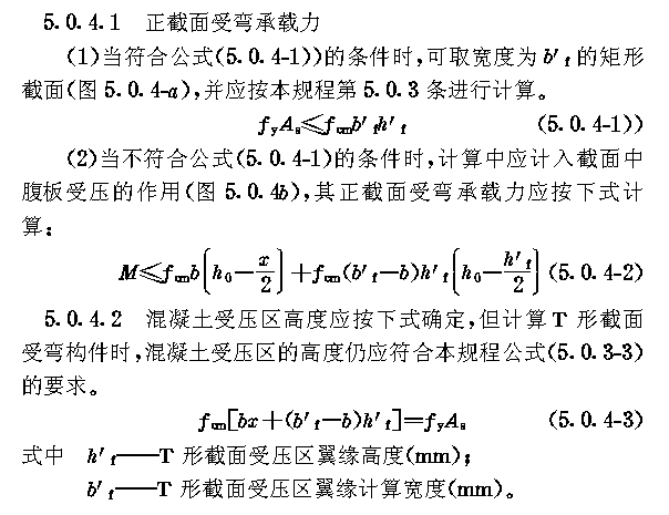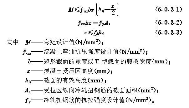承载能力极限状态计算 5.0.1 正截面承载力计算的基本假定应符合现行国家标准《混凝土结构设计规范》GBJ10的有关规定。 5.0.2 受拉冷轧扭钢筋和受压混凝土同时达到其强度设计值时的相对界限受压区的高度ξb应取0.37。 5.0.3 矩形截面或翼缘位于受拉边的T型截面受弯构件(图5.0.3),其正截面受弯承载力应按下列公式计算。 5.0.4 翼缘位于受压区的T形截面受弯构件(图5.0.4),应按下列公式计算。 5.0.5 T形及倒L形截面受弯构件,位于受压区翼缘的计算宽度b''f,应按现行国家标准《混凝土结构设计规范》GBJ10的有关规定确定。 5.0.6 计算受弯构件斜截面受剪承载力时,应按现行国家标准《混凝土结构设计规范》GBJ10有关规定执行。构件中的箍筋和弯起钢筋不宜采用冷轧扭钢筋制作。 5.0.7 冷轧扭钢筋与Ⅰ级钢筋抗拉强度设计代换,可按本规程附录A进行。 5.0.8 冷轧扭钢筋混凝土矩形截面受弯构件纵向受拉钢筋截面面积,可按本规程附录B计算。 |