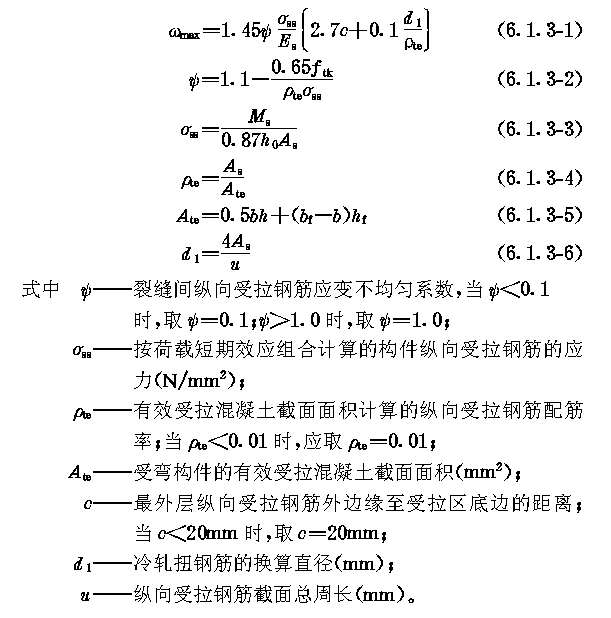 | 正常使用极限状态验算 6.1.1 在使用阶段允许出现裂缝的冷轧扭钢筋混凝土构件,应验算裂缝宽度。按荷载的短期效应组合并考虑长期效应组合的影响所求得的最大裂缝宽度ωmax,不应超过本规程表4.0.5的规定。 6.1.2 对在室内正常环境下的板类受弯构件,当裂缝宽度允许值为0.3mm、混凝土强度等级不低于C20、钢筋直径不大于10mm,且混凝土保护层厚度不大于25mm时,可不验算裂缝宽。此外,当其纵向受拉钢筋直径不超过本规程附录C图C.0.1中查得的钢筋直径时,亦可不验算裂缝宽度。 6.1.3 在矩形、T形、倒L形和工形截面的受弯构件中,根据裂缝宽度分布的不均匀性和荷载长期效应组合的影响,其最大裂缝宽度可按下列公式计算。 |