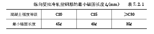| 7.2 冷轧扭钢筋的锚固与接头 7.2.1 当计算中充分利用纵向受拉冷轧扭钢筋强度时,其最小锚固长度应符合表7.2.1的规定。 7.2.2 冷轧扭钢筋不得采用焊接接头,钢筋网和钢筋骨架均应采用绑扎,钢筋末端一般不宜作弯钩,但需要时可弯成90°的直角钩。 7.2.3 纵向受拉冷轧扭钢筋不宜在受拉区截断;当必须截断时,接头位置宜设置在受力较小处,并相互错开。在规定的搭接长度区段内,有接头的受力钢筋截面面积不应大于总截面面积的25%。 7.2.4 纵向受拉冷轧扭钢筋搭接长度不应小于最小锚固长度la的1.2倍,且不应小于300mm。 7.2.5 冷轧扭钢筋在搭接长度范围内,其箍筋的间距不应大于钢筋标志直径d的5倍,且不应大于100mm。 7.2.6 严禁采用冷轧扭钢筋制作预制构件的吊环。