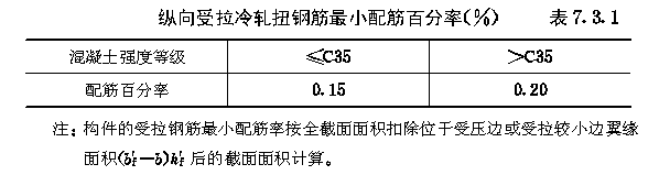 7.3.1 混凝土构件中纵向受力的冷轧扭钢筋其最小配筋百分率,应符合表7.3.1的规定。