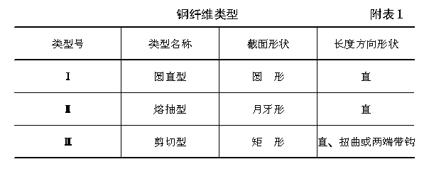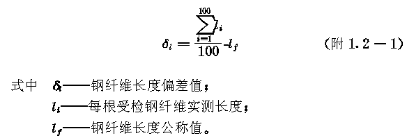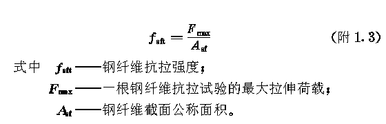 | 附录一 钢纤维混凝土用钢纤维的技术要求 (一)钢纤维的类型可按附表1的规定划分。 (二)钢纤维的形状尺寸及其偏差应满足下列规定: 1.钢纤维长度可分为20、25、30、35、40、45、50mm各种不同规格。 2.钢纤维截面的直径或等效直径应在0.3到0.8mm的范围内。 3.钢纤维长度偏差不应超过长度公称值的±5%。每3t产品随机取样100根,长度偏差按下式计算: (附1.2-1) 4.钢纤维的重量偏差不应超过按尺寸公称值计算重量的±15%。每3t产品随机取样100根,钢纤维重量偏差按下式计算: δ w=Wo-Wc(附1.2-2) 式中 δ w ——钢纤维重量偏差值; Wo——100根钢纤维实测重量; Wc——按钢纤维形状尺寸公称值计算的100根钢纤维理论重量。 (三)钢纤维的抗拉强度不应低于380N/mm2,其抗拉强度按下式计算:(附1.3) (四)钢纤维表面不得粘有油污和其它妨碍钢纤维与水泥浆粘结的杂质。钢纤维内含有的因加工不良造成的粘连片、表面锈蚀纤维、铁屑及杂质的总重量不应超过钢纤维重量的1%。每3t随机取样5kg,用人工挑拣粘连片,锈蚀纤维、铁屑及杂质并称重计算。 |