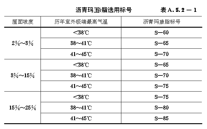 A.5.2 沥青玛王帝脂的标号(耐热度)应视屋面的使用条件,坡度和当地历年极端最高气温,按表A.5.2-1规定选用。