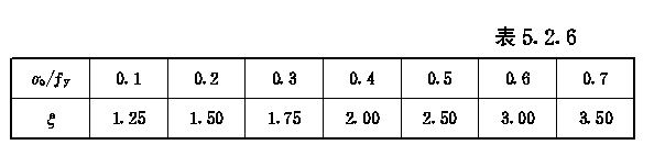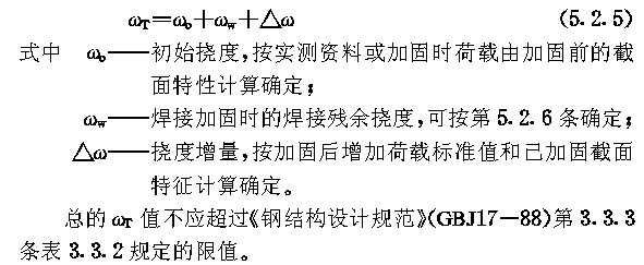 5.2.2 Ⅰ、Ⅱ、Ⅲ类结构的受弯构件截面的抗剪强度τ,组合梁腹板计算高度边缘处的局部承压强度σc和折算应力可分别按《钢结构设计规范》(GBJ17-88)第4.1.2条、第4.13条、第4.1.4条计算;按塑性设计的Ⅳ类构件,可按其第9.2.2条的规定计算腹板的抗剪强度,计算时钢材强度值取计算部位钢材强度设计值。 5.2.3 主平面内受弯的加固构件,当不符合《钢结构设计规范》(GBJ17-88)第4.2.1和4.2.4条规定时,可按其第4.2.2和4.2.3条的规定计算其整体稳定性,但应将钢材的抗弯强度设计值f改取钢材换算强度设计值f0(按5.3.6条规定取值)并乘以折减系数ηm。 5.2.4 组合截面板梁的翼缘和腹板应按《钢结构设计规范》(GBJ17-88)第四章第三节的规定设计和计算其局部稳定,对按塑性设计的第Ⅳ类结构构件,其宽厚比尚应符合其第九章第9.1.4条表9.1.4的规定。 5.2.5 所加固结构构件的总挠ωT一般可按下式确定: 5.2.6 焊接残余挠度ωw应专门研究或接近似由下式确定: (5.2.6) 按 表5.2.6取值; |