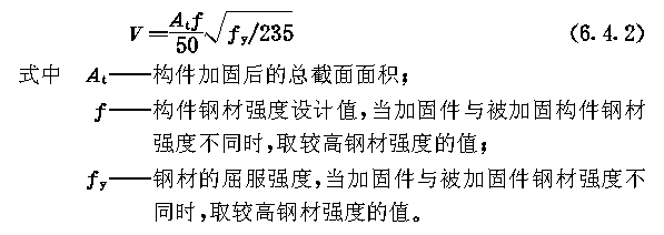 6.4.2 加固件与被加固结构间的连接,应根据设计受力要求经计算并考虑构造和施工条件确定。对于轴心受力构件,可根据公式(6.4.2)计算;对于受弯构件,应根据可能的最大设计剪力计算;对于压弯构件,可根据以上二者中的较大值计算。 对于仅用增设中间支承构件(点)来减少受压构件自由长度加固时,支承杆件(点)与加固构件间连接受力,可按公式(6.4.2)计算,其中At取原构件的截面面积: 6.4.3 加固件的焊缝、螺栓、铆钉等连接的计算可按《钢结构设计规范》(GBJ17-88)第7.1.1条至第7.1.4条和第7.2.1条至第7.2.3条的规定进行,但计算时,对角焊缝强度设计值应乘以0.85,其它强度设计值或承载力设计值应乘以0.95的折减系数。 |