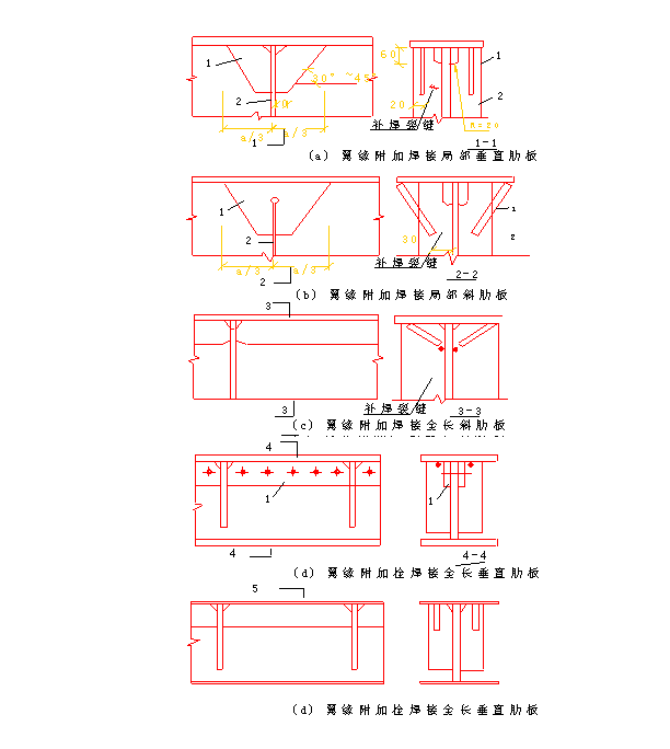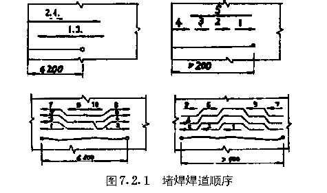 7.2.1.1 清洗裂纹两边80mm以上范围内板面油污至露出洁净的金属面; 7.2.1.2 用碳弧气刨、风铲或砂轮将裂纹边缘加工出坡口,直达纹端的钻孔,坡口的形式应根据板厚和施工条件按现行《气焊、手工电弧焊及气体保护等焊缝坡口的基本型式与尺寸》的要求选用; 7.2.1.3 将裂纹两侧及端部金属预热至100℃~150℃,并在焊接过程中保持此温度; 7.2.1.4 用与钢材相匹配的低氢型焊条或超低氢型焊条施焊; 7.2.1.5 尽可能用小直径焊条以分段分层逆向焊施焊,焊接顺序参见图7.2.1,每一焊道焊完后宜即进行锤击; 7.2.1.6 按设计要求检查焊缝质量; 7.2.1.7 对承受动力荷载的构件,堵焊后其表面应磨光,使之与原构件表面齐平,磨削痕迹线应大体与裂纹切线方向垂直; 7.2.1.8 对重要结构或厚板构件,堵焊后应立即进行退火处理。 7.2.2 对网状、分叉裂纹区和有破裂、过烧或烧穿等缺陷的梁、柱腹板部位,宜采用嵌板修补,修补顺序为: 7.2.2.1 检查确定缺陷的范围; 7.2.2.2 将缺陷部位切除,宜切带圆角的矩形孔,切除部分的尺寸均应比缺陷范围的尺寸大100mm(图7.2.2a); 7.2.2.3 用等厚度同材质的嵌板嵌入切除部位,嵌入板的长宽边缘与切除孔间二个边应留有2~4mm的间隙,并将其边缘加工成对接焊缝要求的坡口形式; 7.2.2.4 嵌板定位后,将孔口四角区域预热至100℃~150℃,并按图7.2.2b所示顺序采用分段分层逆向焊法施焊; 7.2.2.5 检查焊缝质量,打磨焊缝余高,使之与原构件表面齐平。 7.2.3 用附加盖板修补裂纹时,一般宜采用双层盖板,此时裂纹两端仍须钻孔。当盖板用焊接连接时,应设法将加固盖板压紧,其厚度与原板等厚,焊脚尺寸等于板厚,盖板的尺寸和焊接顺序可参照第7.2.2条执行。当用摩擦型高强度螺栓连接时,在裂纹的每侧用双排螺栓,盖板宽度以能布置螺栓为宜,盖板长度每边应超出纹端150mm。 7.2.4 当吊车梁腹板上部出现裂纹时,应检查和先采取必要措施如调整轨道偏心等,再按7.2.1修补裂纹,此外尚应根据裂纹的严重程度和吊车工作制类别分别参照选用图7.24中的加固措施。图7.2.4a |