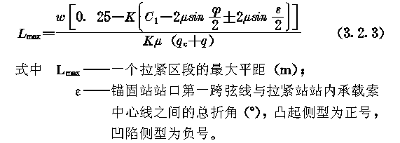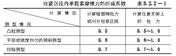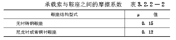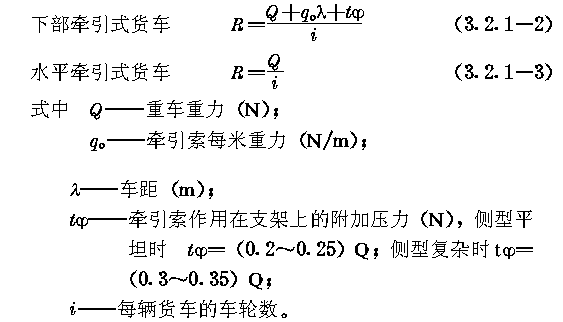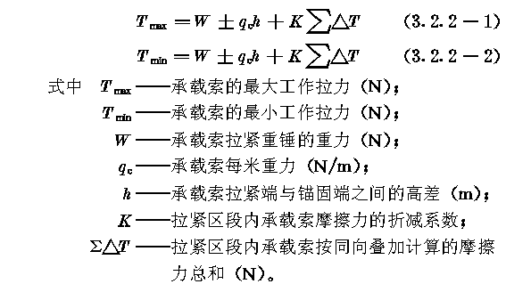 一、承载索应选用密封式钢丝绳,其公称抗拉强度不宜小于1170MPa。 二、承载索拉紧端的初拉力,应按下式计算: 三、每个车轮作用在承载索上的轮压,应按下列公式计算: 四、按初拉力预选承载索时,钢丝绳实际破断拉力与初拉力之比,永久性索道应为4~4.2;临时性索道应为3.5~3.7。 第3.2.2条 承载索的计算,应符合下列要求: 一、承载索的抗拉安全系数,永久性索道应为3.0~3.2,临时性索道应为2.6~2.8。 二、承载索的最大与最小工作拉力,应按下列公式计算: 三、拉紧区段内承载索按同向叠加计算的摩擦力总和,应按下式计算: 四、拉紧区段内承载索摩擦力的折减系数,应符合表3.2.2—1的规定。 五、承载索与鞍座之间的摩擦系数,应符合表3.2.2—2的规定。 第3.2.3条 拉紧区段的划分,应符合下列要求: 一、应采取提高运行速度、降低承载索与鞍座之间的摩擦系数、减少拉紧系统和偏斜鞍座上的摩擦阻力、提高承载索公称抗拉强度、加大拉紧重锤质量等措施,延长拉紧区段的平距。 二、一个拉紧区段的最大平距,应按下式计算: 三、对于多拉紧区段索道,应进行多方案比较,合理划分各拉紧区段。 四、在每个拉紧区段内,承载索锚固端宜设在高端,承载索拉紧端宜设在低端。 五、当凸起地段支架群的摩擦力总和可以阻止承载索滑动时,宜采用两端拉紧方式。 第3.2.4条 承载索的拉紧与锚固,应符合下列要求: 一、在每个拉紧区段内,承载索应采用一端拉紧另一端锚固的方式,不宜采用两端锚固的方式: 二、承载索应采用重锤拉紧方式: 三、拉紧重锤宜采用重锤箱、重锤架或重锤井应便于检查与维护、重锤井应设井盖和排水设施; 四、每个重锤箱应配备两根金属导轨。两个重锤箱之间的净空不得小于400mm; 五、锚固端应采用允许串绳的夹块式、夹楔式或夹块夹楔联合式锚具;套筒式锚具和圆筒式锚具不宜采用; 六、锚固端和拉紧端应设串绳装置,并应在锚固端设置承载索储绳装置。 第3.2.5条 拉紧索及其导向轮的选择应符合下列要求: 一、承载索的拉紧索,应选用6△(42)或6(33)+6△(21)同向捻钢丝绳,其公称抗拉强度不宜低于1520MPa; 二、承载索的拉紧索,其抗拉安全系数不得小于4.5; 三、承载索的拉紧索,其导向轮直径与拉紧索直径之比,不得小于25。 第3.2.6条 拉紧重锤的行程,应使重锤在索道运行过程中始终呈悬空状态。计算重锤行程时,应计入承载索的弹性伸长、残余伸长、温度伸长和载荷变化所引起的重锤位移,并应计入0.5~1.0m的余量。 第3.2.7条 承载索的连接,应符合下列要求: 一、在一个拉紧区段内,宜采用整根的密封式钢丝绳; 二、线路套筒宜采用楔接。线路套筒与支架的距离,不得小于15m; 三、过渡套筒内承载索的末端宜采用楔接。拉紧索的末端应采用铸接。 第3.2.8条 鞍座的选择应符合下列要求: 一、承载索的最大折角小于等于16°时,应选用摇摆鞍座;大于16°时,可选用带垂直滚轮组的固定鞍座; 二、摇摆鞍座、固定鞍座和偏斜鞍座,宜设尼龙衬垫; 三、鞍座的曲率半径,应按下式计算: R≥0.5ν2(3.2.8) 式中R——鞍座的曲率半径(m); 四、当货车运行速度较低时,无衬或青铜衬鞍座的曲率半径不得小于承载索直径的100倍;尼龙衬鞍座的曲率半径不得小于承载索直径的150倍; 五、拉紧区段站的固定鞍座,其曲率半径不得小于20m。 |