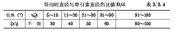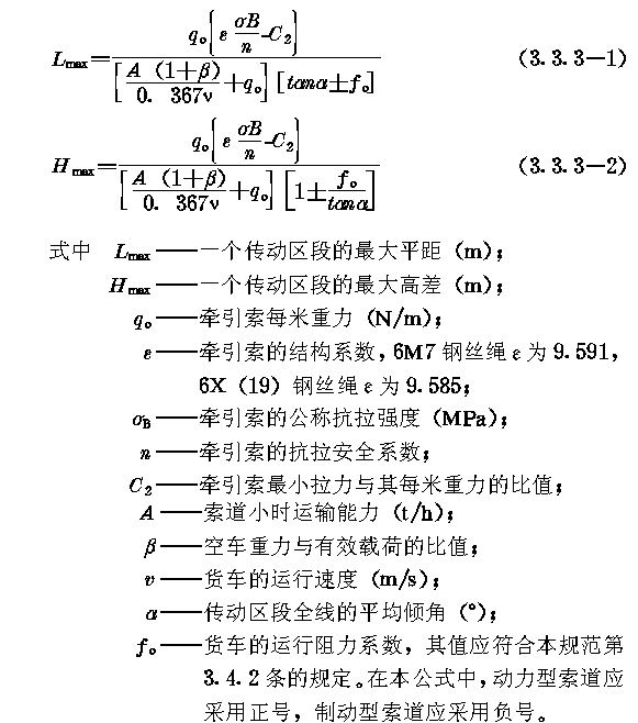 一、牵引索应选用6M7面接触、6X(19)线接触的同向捻钢丝绳,其公称抗拉强度不宜小于1520MPa; 二、牵引索不得采用交互捻钢丝绳; 三、钢丝绳表面丝的直径不得小于1.5mm。 第3.3.2条 牵引索的抗拉安全系数应为4.5~5.0。 第3.3.3条 传动区段的划分应符合下列要求: 一、应采取提高运行速度、增大牵引索直径,提高牵引索公称抗拉强度、改善驱动装置防滑性能、实现两端驱动或双轮驱动等措施,延长传动区段的平距。 二、采用一端驱动时,一个传动区段的最大平距或最大高差,应按下列公式计算: 三、对于多传动区段索道,应进行多方案比较,合理划分各传动区段。 四、在多传动区段索道中,各传动区段牵引索的直径必须相同,各驱动装置的型号宜统一。 五、在多传动区段索道中,宜将转角站兼作中间驱动站或中间拉紧站。 第3.3.4条 导向轮直径与牵引索直径的比值,应符合表3.3.4的规定。 第3.3.5条 牵引索的编接与拉紧应符合下列要求: 一、牵引索应减少编接接头的数量; 二、牵引索应采用重锤拉紧方式; 三、拉紧重锤的结构与配置,应符合本规范第3.2.4条的规定; 四、高架站房可采用单绳拉紧方式;单层站房应采用四绳拉紧方式,并应设置调节重锤位置的电动或手动绞车。 第3.3.6条 拉紧装置的选择应符合下列要求: 一、拉紧轮的直径,应按索距确定,并应符合本规范第3.3.4条的规定; 二、拉紧轮的绳槽,宜衬软质耐磨衬垫; 三、拉紧小车的行程,至少应保证牵引索剁一次接头所需补偿的长度。 第3.3.7条 拉紧索及其导向轮的选择,应符合下列要求: 一、牵引索的拉紧索,当采用单绳拉紧方式时,应先用6X(37)、6W(36)或6XW(36)线接触的同向捻钢丝绳;当采用四绳拉紧方式时,应选用6T(25)或6X(19)线接触的同向捻钢丝绳;其公称抗拉强度不宜小于1520MPa; 二、牵引索的拉紧索,其抗拉安全系数不得小于5; 三、牵引索的拉紧索,其导向轮直径与拉紧索直径之比,不得小于40; 四、导向轮的绳槽,应衬软质耐磨衬垫。 |