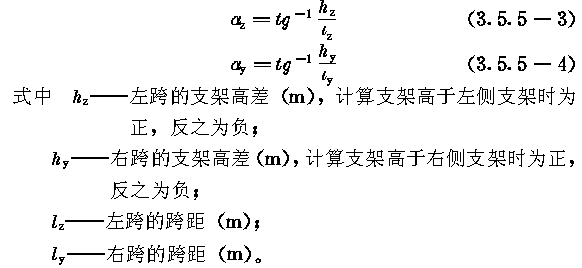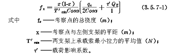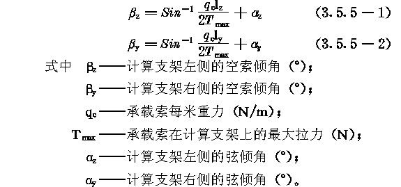 一、索道侧型不应有突变的折曲或过多的起伏。 二、比高较大的独立山峰或凸起地段的突出山包,宜采取开挖边坡,明槽或涵洞等措施。 三、凸起侧型每个支架的弦折角,下部牵引式索道宜为3~4%;水平牵引式索道宜为5~6%。 四、每个支架的最大折角,应控制在10~15%范围内。 大跨距两端的支架,其最大折角不得超过30%。 五、不同折角的支架,应选择不同允许折角的鞍座。 第3.5.2条 索道负荷应均匀,并应符合下列要求: 一、同时驶近支架的重车数,不得超过线路上重车总数的25%。 二、跨距与车距的水平投影的比值,应为0.3~0.4、0.8、1.15~1.3、1.75、2.3~2.6和3.45。 第3.5.3条 站房设置应合理,并应符合下列要求: 一、驱动站: 1.应选择牵引索拉力最大、抗滑条件最好的端站作为驱动站。动力型索道的卸载站和制动型索道的装载站应为驱动站。介于动力和制动型之间的索道。可按供电、维修、交通等条件确定驱动站的位置; 2.多传动区段索道相邻两段的驱动装置,宜集中设置在中间驱动站内; 3.当相邻两个传动区段的功率为一正一负,或两段功率符号相同但两段高差之和较大需控制牵引索直径时,宜采用一台卧式驱动装置同时传动两段的中间驱动方案。 二、拉紧站: 1.应选择没有驱动装置的端站作为拉紧站; 2.当没有驱动装置的端站内设有自动迂回轮时,驱动站应兼作拉紧站; 3.当驱动站兼作拉紧站时,牵引索的重锤应设在驱动装置牵引索拉力较小的一侧; 4.对于地形起伏较大或线路中凸起地段高于驱动站的长距离索道,在最不利的载荷情况下驱动站的牵引索产生不允许的低拉力时,宜在驱动装置牵引索拉力较小的一侧设置辅助拉紧装置。辅助重锤所产生的牵引索拉力,应小于牵引索正常运行时的拉力。 三、转角站: 1.转角站应与传动区段站、拉紧区段站、中间装卸站或交汇站合并,做到一站多用,避免设置单一功能的中间站; 2.自动转角站不宜设在索道侧型的最低处; 3.自动转角站的水平滚轮组,应采用较大的曲率半径。 四、拉紧区段站: 1.拉紧区段站承载索的进、出站角,其仰角宜小于5%,不宜采用凹形滚轮组。 2.拉紧区段站的凸形或凹形滚轮组,应采用较大的曲率半径,并应按本规范第3.6.6条的规定进行校验。 3.位于凸起地段的双锚站,宜采用带有大曲率半径凸形垂直滚轮组的连环架。 4.双锚站的高度不得小于5m。拉锚站和双拉站的高度根据重锤行程等因素确定,一般情况下不得小于9m。 5.拉紧端承载索在偏斜鞍座上的站内折角、空、重车侧承载索的平面折角,不得大于15%;重车侧承载索的立面折角,不得大于12%;空车侧承载索的立面折角、不得大于15%。锚固端承载索在偏斜鞍座上的站内折角,可适当增大。 第3.5.4条 配置支架时,应减小各支架上牵引索的附加压力,并应符合下列要求: 一、站前第一跨支架配置: 1.承载索仰角进站时,其空索倾角应大于扁轨倾角,但两者之差不宜大于5%。 承载索俯角进站时,其空索倾角应小于扁轨倾角,但两者之差不宜大于5%。 2.承载索满载时站口端的倾角,不得大于15%。 3.站前第一跨的跨距,宜小于车距,并宜小于60m。 二、平坦地段或坡度均匀的倾斜地段支架配置: 1.各支架的跨距,宜按照重车侧牵引索拉力的逐跨增大而逐跨减小; 2.各支架上牵引索的附加压力,不宜大于重车重力的0.2~0.25倍。 三、凸起地段支架配置: 1.支架高度不得小于5m,跨距不得小于20m; 2.对于总折角较大并受到地形限制的凸起地段,可采用带有大曲率半径凸形垂直滚轮组的的连环架代替支架群。 四、凹陷地段支架配置: 1.当支架相邻跨距内没有货车、承载索出现最大拉力和不计风力时,承载索对鞍座的靠帖系数不得小于1.2; 2.在困难条件下,当采用带有防抬索装置的鞍座时,承载索在支架上的最小折角,允许出现适当的负值。 3.当大跨距两端支架上的最大折角超过摇摆鞍座的许用折角时,应在支架附近设立辅助支架。不得在一个支架的同一侧上设置两个摇摆鞍座。 第3.5.5条 支架的空索倾角,应按支架相邻跨距内没有货车和承载索出现最大拉力的条件确定。 一、空索倾角应按下列公式计算: 二、弦倾角应按下列公式计算: 第3.5.6条 支架的重索倾角,应按线路上均匀布满重车、其中一辆重车紧靠计算支架左侧或右侧和承载索出现最小拉力的条件确定。 一、重索倾角应按下列公式计算: 二、载荷分配系数应按下列公式计算: 第3.5.7条 考察点的总挠度,应按线路上均匀布满重车、其中一辆重车刚好运行到考察点上方和承载索出现最小拉力的条件确定。 一、考察点的总挠度应按下式计算: 二、载荷影响系数,应按下式计算: |