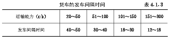 第四章 单线循环式货运索道工程设计 第4.1.1条 货车的选择,应符合下列要求: 一、爬坡角为20°及以下时,可选用可鞍式抱索器。承载能力为1t及以下,运行速度为2.5m/s及以下和爬坡角为20°~28°时,可选用四连杆式抱索器。承载能力大于1t、运行速度高于2.5m/s和爬坡角大于28°时,可选用弹簧式抱索器。 二、货车选择的其他要求,应符合本规范第3.1.1条的规定。 第4.1.2条 货车的设计,应符合下列要求: 一、货车的承载能力应为0.4、0.7、1.0和1.25t; 二、货车的容积应为0.25、0.32、0.4、0.5、0.63、0.8、1.0和1.25m 3 ; 三、货车设计的其他要求,应符合本规范第3.1.2条的规定。 第4.1.3条 货车的发车间隔时间,宜符合 表4.1.3 的规定。 |