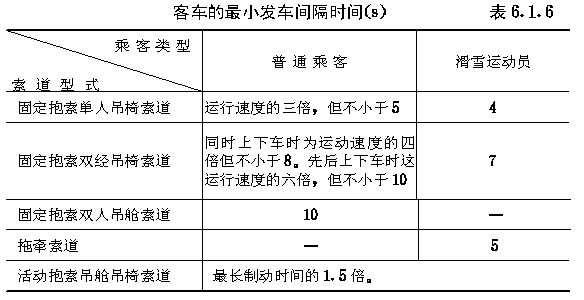 第六章 单线循环式客运索道工程设计 第6.1.1条 每个乘客的计算载荷,应符合下列规定: 一、客车定员为1~4人时,每个乘客应为740N。客车定员6~8人时,每个乘客应为690N。 二、对于滑雪或登山运动专用索道,每个乘客的计算载荷,尚应增加100N。 第6.1.2条 客车的计算,应符合下列要求: 一、客车的主要载荷,应为空车重力和乘客的计算载荷。次要载荷应为风载荷、制动惯性力和客车通过导向装置的摩擦阻力。 二、按主要载荷计算时,客车主要承载构件和重要部件的安全系数,不得小于5。 在主要载荷和次要载荷联合作用下,特别是在承受扭转和疲劳载荷时,各主要承载构件和重要部件,应校核其强度和刚度。 第6.1.3条 抱索器的设计,应符合下列要求: 一、客车在线路上运行时,抱索器不得脱开承载牵引索或在承载牵引索上滑动。 二、单钳口抱索器的抗滑力,不得小于重车的重力和重车在最大坡度处斜面分力的3倍。 双钳口抱索器应有两个独立的抗滑力。任一钳口的抗滑力,不得小于重车重力的0.5倍和重车在最大坡度处斜面分力的1.5倍。 三、钳口与经过润滑的承载牵引索之间的摩擦系数应为0.13。 特殊设计的钳口,经过试验与鉴定后,可采用较高的摩擦系数。 四、钳口的形状与尺寸,应与托、压索轮组的轮槽相适应。 客车横向摆动35时,抱索器应能顺利通过托、压索轮组。 五、钳口的端部应充分倒角,端部的内、外棱角应修圆。 六、固定式抱索器应能顺利通过驱动轮和拉紧轮,迂回时所产生的水平折角不得大于9°。 七、固定式抱索器应定期改变其夹紧位置。 每次改变的距离,单钳口固定式抱索器不得小于承载牵引索直径的15倍,双钳口固定式抱索器不得小于承载牵引索直径的30倍。 每次改变的运行间隔时间,应按下式计算: τ=0.56(l/ν)(6.1.3) 式中τ——改变夹紧位置的运行间隔时间(h); 八、活动式抱索器应有在运行中测定其夹紧力的机构。 九、活动式抱索器的车轮和鹰咀,其材料宜采用减振和吸音的增强尼龙。 第6.1.4条 吊椅的设计,应符合下列要求: 一、吊杆或吊架的高度,应按吊椅在最大坡度处纵、横向摆动35时,顶蓬、座椅或乘客伸出的手部,不得接触承载牵引索或支架任何部位的条件确定。 二、座椅的有效宽度,单人吊椅不得小于500mm;双人吊椅不得小于950mm;三人吊椅不得小于1380mm;四人吊椅不得小于1800mm。 三、椅面和靠背应向后倾斜。 座椅两侧应设高出椅面250~300mm的护栏。 四、吊椅应设活动式安全扶手与踏板。 安全扶手与踏板应联动,并应便于乘客上、下车。 五、采用活动式抱索器的吊椅,吊杆或吊架与座椅的连接处,应设减振装置。 第6.1.5条 吊舱的设计,应符合下列要求: 一、吊杆或吊架的高度,应按吊舱在最大坡度处纵、横向摆动35时,车厢不得接触承载牵引索或支架任何部位的条件确定。 二、吊杆或吊架与车厢的连接处,应设减振装置。 三、车内座位的有效宽度,双人吊舱不得小于500mm;四人吊舱不得小于950mm;六人吊舱不得小于1380mm;八人吊舱不得小于1800mm。 四、车厢的承载结构,宜采用铝合金。 座椅、内外蒙皮和其他围护结构,应采用轻质材料。 五、车窗应采用耐碎裂的透明材料,其结构应能预防乘客发生意外事故。 六、车门应设自动开关机构。 七、车内应有通风设施。 八、吊杆的中部或车厢两侧的外部,应设导向滚轮或导向立杆。 第6.1.6条 客车的最小发车间隔时间,不得小于 表6.1.6 的规定。 |