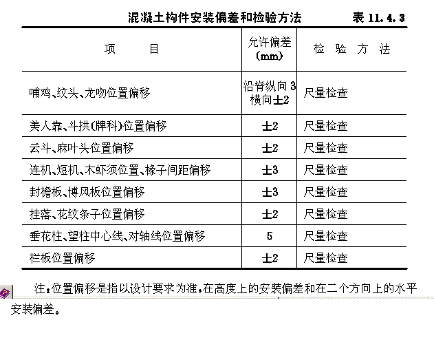 11.4.3 混凝土构件安装偏差和检验方法应符合 表11.4.3 的规定。 检查数量:同11.1.2条的规定。