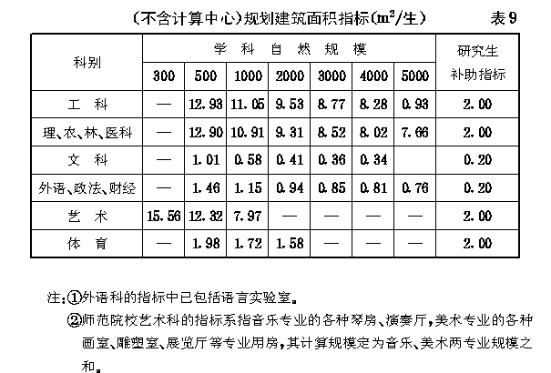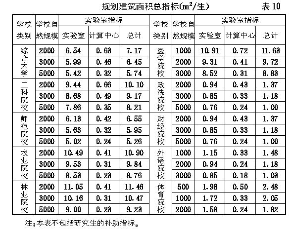 第四节 实验室实习场所及附属用房 第二十条 实验室实习场所及附属用房包括基础课、专业基础课、专业课、自选科研项目所需的各种实验室、实习工厂农场牧场林场、实验室的附属用房(准备室、天平室、仪器室、标本室、模型室、陈列室、动物室、充电室、空调室、更衣室、实验人员办公室等)、全校公用的计算中心等。个别学校设立的分析测试中心应专案报批,不在本指标之内。专职科研机构的实验室、资料室、生产性工厂农场林场、医学院的附属医院、师范院校的附中附小幼儿园等均不在本指标之内。 第二十一条 按科类分的实验室实习场所及附属用房(不含计算中心)的规划建筑面积指标不宜超过 表9 的规定。 第二十二条 按学校类别分的实验室实习场所及附属用房的规划建筑面积总指标不宜超过 表10 的规定。 |