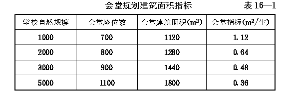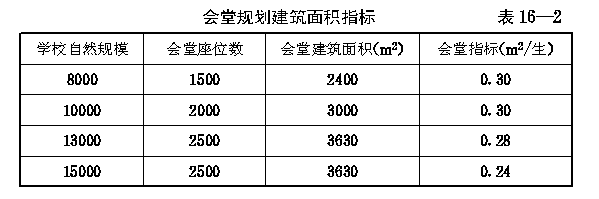 第三十条 1000人及1000人以上规模的学校可规划建设一座会堂。会堂的规划建筑面积指标不得超过 表16—1 的规定。