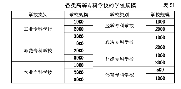 第三章 高等专科学校校舍规划建筑面积指标 第一节 一般规定 第四十五条 高等专科学校校舍的构成、规划建筑面积指标采用的基本参数、学校科类结构的预测值、各项校舍的内容等均按第二章大学、专门学院的有关规定执行。 第四十六条 各类高等专科学校的学校规模(以全日制在校学生人数计)按表21的规定执行。 本规划指标中的各项指标均按表21所列的规模分别制定。如学校的实际规模小于或大于本类学校的最小规模或最大规模时,其规划指标应分别采用表中最小规模或最大规模的指标值;学校实际规模介于表列规模之间时可用插入法取值。 第四十七条 高等专科学校的校舍规划建筑面积指标应按下列规定执行: 一、以学校规模为基本参数的十一项校舍的规划建筑面积总指标不得超过表22—1的规定。 二、以主管部门批准的全校教职工人员编制总数为基本参数的两项校舍规划建筑面积指标不得超过表22—2的规定。 第四十八条 高等专科学校聘有外籍教师或设有专职科研机构、夜大学函授部、设计研究院(所、室)时,其校舍规划建筑面积指标按大学、专门学院的有关规定执行。