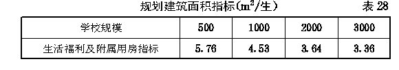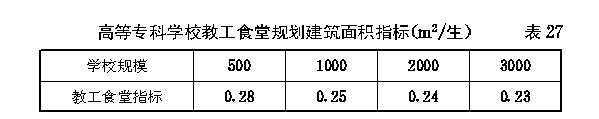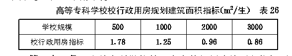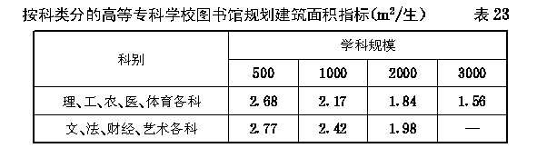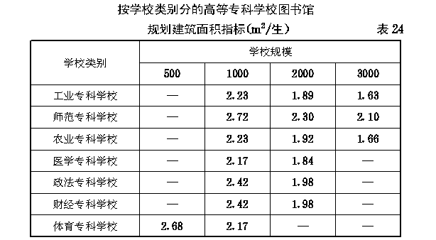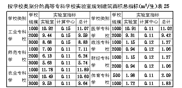 第二节 高等专科学校各项校舍规划建筑面积指标 第四十九条 高等专科学校的教室、风雨操场、系行政用房、会堂、学生宿舍、学生食堂的规划面积指标均按大学、专门学院的有关规定执行。 第五十条 高等专科学校图书馆的规划建筑面积指标应按下列规定执行: 一、按科类分的图书馆规划建筑面积指标不宜超过 表23 的规定。 第五十一条 高等专科学校实验室实习场所及附属用房(以下简称“实验室”)的规划建筑面积指标应按下列规定执行: 一、按科类分的实验室规划建筑面积指标与大学、专门学院相同(见表9)。 二、按学校类别分的实验室规划建筑面积总指标不宜超过 表25 的规定。 第五十二条 高等专科学校每百名教职工安排住宅60套。各级教师的结构比例按照正教授占专任教师总数的3%,副教授占12%,讲师占50%、助教占35%计算;各级各类人员的居住标准与大学、专门学院相同(见第三十六条)。 教工住宅的规划建筑面积指标(以主管部门批准的全校教职工人员编制总数为基本参数)不得超过33.06m 2 /人。 第五十三条 高等专科学校每百名教职工安排20名单身人员的教工宿舍。各级各类单身人员的居住标准与大学、专门学院相同(见第三十九条)。教工宿舍的规划建筑面积指标(以主管部门批准的全校教职工人员编制总数为基本参数)不得超过2.25m 2 /人。 第五十四条 高等专科学校校行政用房的规划建筑面积指标不得超过 表26 的规定。 第五十五条 高等专科学校教工食堂的规划建筑面积指标不得超过 表27 的规定。 第五十六条 高等专科学校生活福利及其他附属用房的规划建筑面积指标不得超过 表28 的规定。
