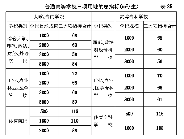 第四章 普通高等学校规划建设用地指标 第一节 一般规定 第五十七条 每所普通高等学校都应安排的规划建设用地包括各校都应配备的十三项校舍所需的建设用地、体育设施建设用地及专用绿地三大项。 根据需要已配备了其他六项校舍(或其中的一部分)的学校尚应安排相应的校舍建设补助用地。某些院校根据教学的需要还应安排专门的实习用地如农场、牧场、林场、靶场、农机及汽车驾驶实习场、生物实习园等。本用地指标中未包括下列各项用地面积: 一、起伏较大不适于进行建筑的山地以及河流、池溏、湖泊等。 二、除农场、林场、牧场、树木园、生物实习园外的各种专门实习用地。 三、规模较大的学校的垃圾转运场及堆煤场。 四、规划建筑面积中未包括的八项校舍(见第八条)所需的建设用地。 学校需要上述四种用地的某些部分时,应在本用地指标之外专案报请有关主管部门另行拨给。 第五十八条 普通高等学校校舍建设用地、体育设施建设用地、专用绿地、专门实习场地的规划用地指标均应采用学校(或系)的自然规模为基本参数。校舍建设用地补助指标应分别采用各种有关的教职工人数及学生人数为基本参数。 第五十九条 普通高等学校在工程的规划与建设中必须科学合理、节约用地,尽量集中紧凑地进行布置,在不影响使用功能的前提下适当提高建筑层数与建筑覆盖率。教室、图书馆、实验科研用房、教工住宅、教工宿舍、学生宿舍等项建筑的平均层数不低于4.5层,建筑覆盖率不小于23.5%;食堂、风雨操场、会堂,仓库及一些生活福利附属用房的平均层数不低于1.5层,建筑覆盖率不小于31.5%。 第六十条 每所普通高等学校都应安排的三大项用地的规划建设用地总指标不宜超过 表29 的规定。