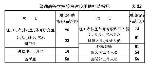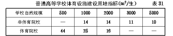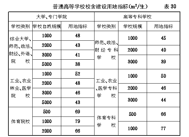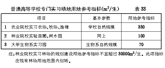第二节 各项用地规划指标 第六十一条 普通高等学校校舍建设用地指标不宜超过 表30 的规定。 第六十二条 普通高等学校体育设施建设用地指标(大学、专门学院与高等专科学校相同)不宜超过 表31 的规定。 第六十三条 普通高等学校专用绿地的规划指标(大学、专门学院与高等专科学校相同)不宜超过6m 2 /生。 第六十四条 普通高等学校校舍建设用地补助指标不宜超过 表32 的规定。 第六十五条 普通高等学校可根据实际需要参照 表33 的规定(大学、专门学院与高等专科学校相同)编制专门实习场地用地计划并报主管部门审批。