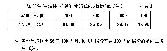 附录一 大学、专门学院留学生及外籍教师生活用房规划建筑面积指标 一、留学生生活用房包括留学生居室、盥洗室、浴室、厕所、食堂、洗衣房、生活锅炉房、辅导教室、阅览室、文娱室、会客室、管理人员办公室、值班室等。留学生生活用房应根据主管部门批准的留学生人数进行配备,其规划建筑面积指标不得超过 附表1 的规定。 二、外籍教师生活用房包括其单元式住宅及其他生活用房(食堂、文娱室、阅览室、会客室、管理人员办公室、值班室等)。外籍教师生活用房应根据主管部门批准的人数进行配备。单身的一般教师住一室户,单身的教授及带眷教师住二室户,带眷并携带子女的教师住三室户。平均每户的建筑面积,一室户45m 2 /生,二室户65m 2 ,三室户80m 2 。每套住宅配备居室、卫生间、厨房,室内设壁橱。三室户的套数不宜超过总套数的15%。外籍教师的其他生活用房的规划建筑面积指标不宜超过 附表2 的规定。