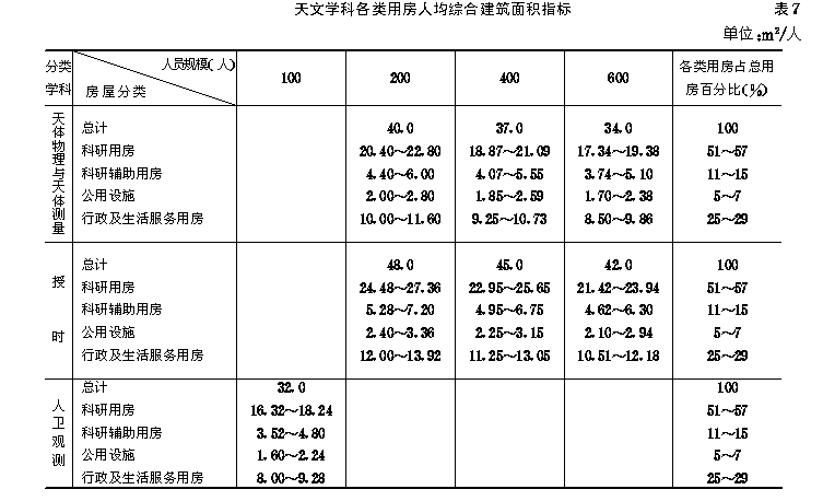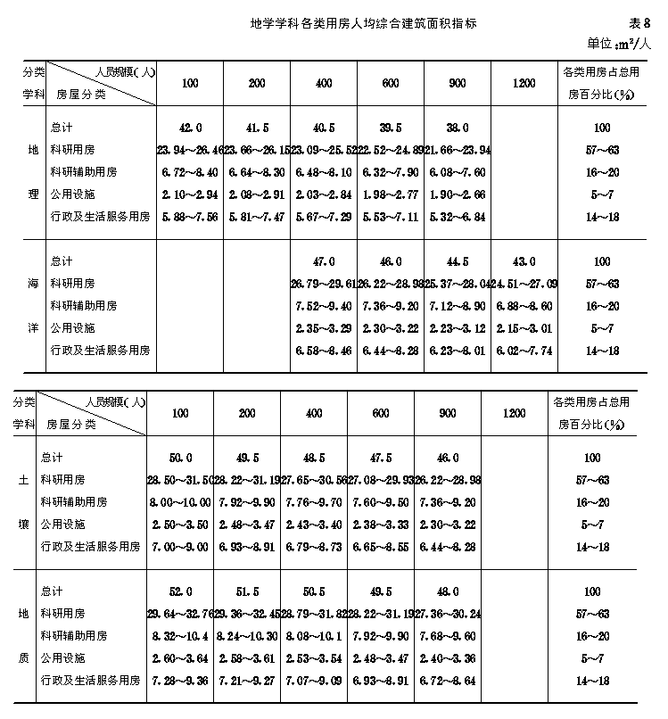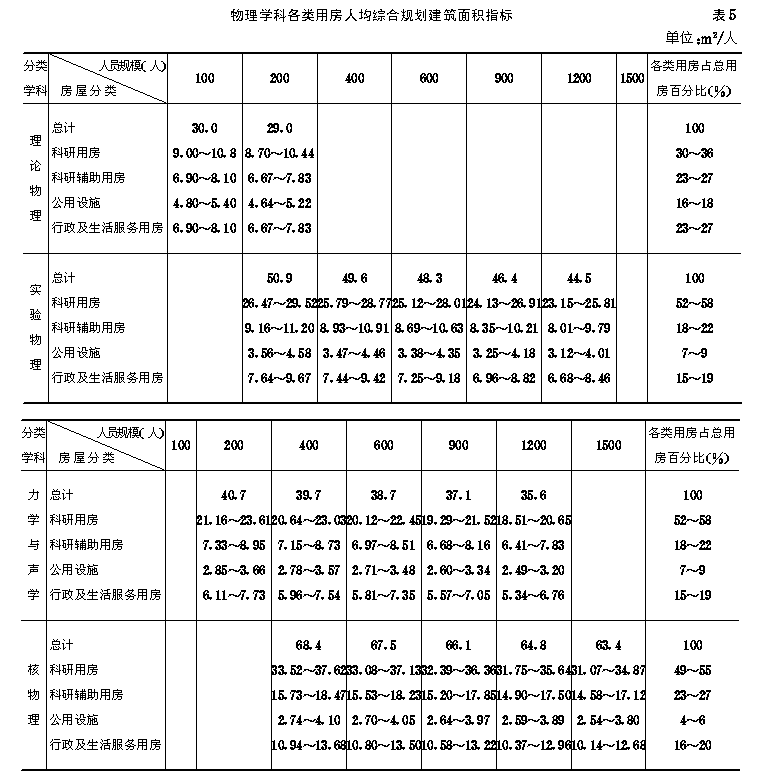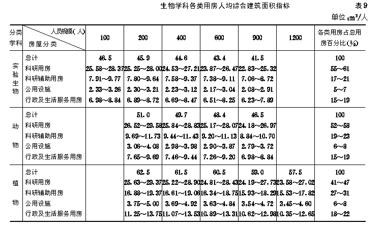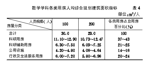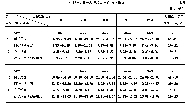 第三章 各类用房规划建筑面积指标 第十三条 数学学科各类用房人均综合规划建筑面积指标及其占总用房的比例,应按表4采用。 第十四条 物理学科各类用房人均综合规划建筑面积指标及其占总用房的比例,应按表5采用。 第十五条 化学学科各类用房人均综合规划建筑面积指标及其占总用房的比例,应按表6采用。 第十六条 天文学科各类用房人均综合规划建筑面积指标及其占总用房的比例,应按表7采用。 第十七条 地学学科各类用房人均综合规划建筑面积指标及其占总用房的比例,应按表8采用。 第十八条 生物学科各类用房人均综合规划建筑面积指标及其占总用房的比例,应按表9采用。 第十九条 技术科学学科各类用房人均综合规划建筑面积指标及其占总用房的比例,应按表10采用。