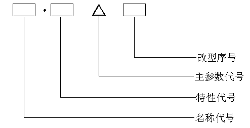 产品型号编制 3.1 产品型号的基本格式 3.2 名称代号 3.2.1 名称代号不得超过三个拉丁字母表示。 3.2.2 名称代号的字母依次代表产品的主称、品种、型式或产品所属的类、组、型,也可只代表其中一部分要素。 3.2.3 名称代号应按各行业现行产品分类及代号标准的规定采用。 3.3 特性代号 3.3.1 特性代号不得超过两个拉丁字母或阿拉伯数字表示。 3.3.2 特性代号表示产品的材料、构造、工艺或精度等特性,但不包括已纳入名称代号的特性。 3.3.3 当产品的某一特性为数或序数时,其特性代号可依次采用拉丁字母A、B、C……代替阿拉伯数字1、2、3……。 当特性代号直接采用阿拉伯数字表示时,其位置不得与主参数代号相邻,必要时可移至名称代号之前或之中。 3.3.4 当名称代号和特性代号的字符总数不超过三个而又不致混淆时,特性代号前的分隔符可省略。 3.3.5 如无必要,产品型号中可不列特性代号及其分隔符。 3.4 主参数代号 3.4.1 一种产品可选一个或多个主参数。 3.4.2 当有两个或两个以上主参数时,计量单位相同的主参数之间用连接符“×” 连接,计量单位不同的用连接符“/”连接。当不致混淆时,“×”可省略。 3.4.3 确定主参数数值时,应采用中华人民共和国法定计量单位。 3.4.4 主参数代号可采用产品主参数的实际数值表示,也可采用主参数数值的10n(n=-3、-2、-1、1、2、3)倍数表示。 3.4.5 当主参数的数目过多时,可采用产品标准中规定的一个有代表性的阿拉伯数字表示该产品的某一组主参数。 3.5 改型序号 3.5.1 根据产品的改型设计顺序,改型序号依次采用拉丁字母A、B、C……表示。 3.5.2 第一次设计的产品不加改型序号。
