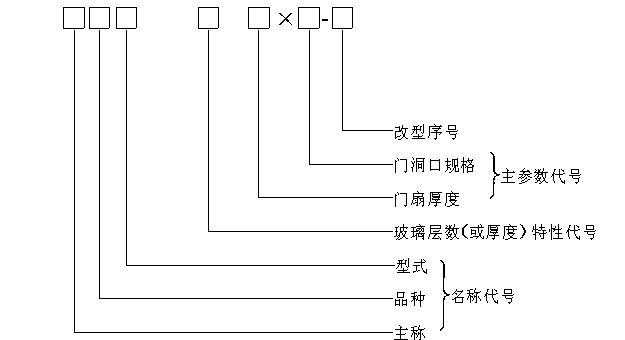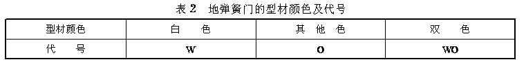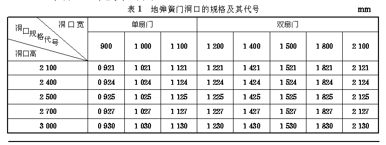 3 规格和型号 3.1 塑料地弹簧门的门扇型材厚度为60mm。 3.2 地弹簧门的洞口尺寸系列与规格 3.2.1 门的宽度、高度尺寸,主要根据门扇框厚度,门的力学性能要求、洞口尺寸及安装要求确定。 3.2.2 地弹簧门洞口的规格及其代号,见表1。 3.2.3 除表1的规定外,当采用门与门、门与窗组合时,组合后的洞口尺寸应符合GB/T5824的规定。 3.3 门的型材颜色分为白色、其他色和双色,其代号见表2。 3.4 产品型号 产品型号由产品的名称代号、特性代号、主参数代号组成。图例 3.4.1 产品名称及代号 塑料地弹簧门MSD 3.4.2 特性代号 玻璃层数A为一层,B为二层。 3.4.3 主参数代号 门扇框厚度60mm。 门洞口规格见表1。 3.4.4 示例: 塑料地弹簧门、单玻、门扇框厚度为60mm、洞口宽为1400mm、洞口高为2400mm,第一次设计: MSD·A·60×1424/1