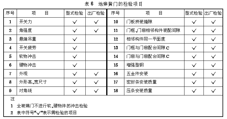 检验规则 6.1 出厂检验 应在型式检验合格后的有效期内进行出厂检验,否则检验结果无效。 6.1.1 出厂检验项目见表6,按本标准规定的方法检验,不合格的产品不允许出厂。产品出厂时,应附有合格证。 6.1.2 抽样方法 产品出厂前应按每一批次、品种、规格随机抽样,抽检量不得少于3档。 6.1.3 判定规则 根据表6规定的出厂检验项目,检验塑料地弹簧门的性能。当其中某项性能指标不合格时,应加倍抽样,对不合格的项目进行复检,如该项仍不合格,则判定该批产品为不合格品。经检验,全部检验项目符合本标准规定的合格指标,则判定该批产品为合格品。 6.1.4 凡在定货合同中,未对门的力学性能提出要求时,则其力学性能不应低于本标准4.6规定的合格指标。 6.2 型式检验 6.2.1 有下列情况之一时,应进行型式检验 a)新产品或老产品转厂生产的试制定型鉴定; b)正式生产后,如结构、材料、工艺有较大改变,可能影响产品性能时; c)正常生产时,每两年检测一次; d)产品长期停产后,恢复生产时; e)出厂检验结果与上次型式检验有较大差异时; f)国家质量监督机构提出进行型式检验的要求时。 6.2.2 型式检验项目见表6。 6.2.3 抽样方法 批量生产时,每两年由合格的产品中随机抽取3樘进行型式检验。 6.2.4 判定规则 根据表6中规定的型式检验项目,检验地弹簧门的性能,当其中某项不合格时,应加倍抽样,对不合格项目进行复检,如该项仍不合格,则判定该批产品为不合格品。经检验,全部检测项目符合本标准中规定的合格指标,则判定该批产品为合格品。 6.3 仲裁检验,当供需双方对产品质量发生争议时,按本标准由国家法定检测机构进行仲裁检验。