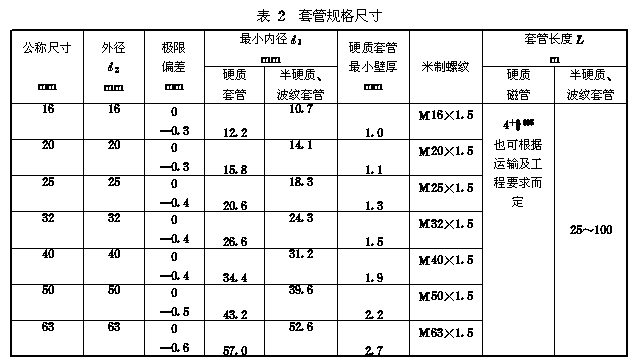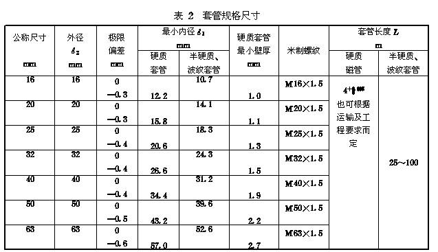 5.1.1 套管规格尺寸 套管规格尺寸应符合表2的规定。