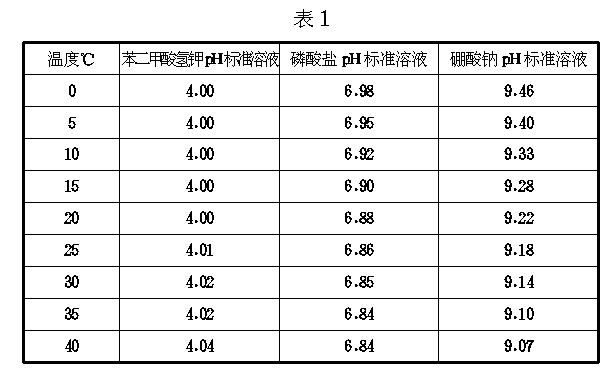 试剂 5.1 pH标准溶液(pH=4.008、25℃)准确称取105~130℃干燥2~3h并恒重的邻苯二甲酸氢钾(KHC 8H 4 O 4 ) 10. 21g(精确至0.001g),溶于适量水中,定容至1000mL。 5.3 pH标准溶液(pH=9.18、25℃)准确称取在105~130℃干燥2~3h并恒重的硼酸钠(Na 2 B4O7 ·10H 2 O)3.81g(精确至0.001g),溶于适量水中,定容至1000mL。以上三种标准溶液pH值随温度变化情况,见 表1 。 5.4 袋装标准物质:须经国家计量部门检定合格的产品,按说明书使用。注:配好的标准溶液应贮于聚乙烯瓶或硬质玻璃瓶中密封保存,在室温下保存1个月,温度为4℃时可延长使用期限。 5.5 0.1mo1/Lkcl溶液称取经100~130℃干燥2~3h并恒重的kc17.45g溶于适量水中,定容至1000mL。 5.6 试验用水:本标准所用蒸馏水均需在使用前煮沸数分钟,排除二氧化碳冷却后使用。