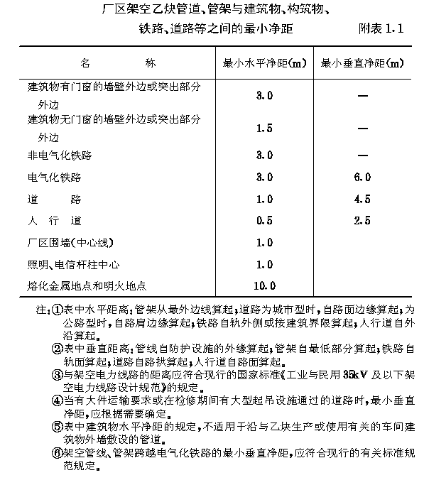 附录一 厂区架空乙炔管道、管架 与建筑物、构筑物、铁路、道路等之间的最小净距