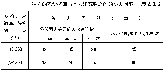 第二章 乙炔站的布置 第2.0.1条 乙炔站、乙炔汇流排间的布置,应根据下列要求,经技术经济方案比较后确定: 一、乙炔站严禁布置在易被水淹没的地点; 二、不应布置在人员密集区和主要交通要道处; 三、气态乙炔站、乙炔汇流排间宜靠近乙炔主要用户处; 四、应有良好的自然通风; 五、应有近期扩建的可能性。 第2.0.2条 乙炔站应布置在氧气站空分设备吸风口处全年最小频率风向的上风侧。 乙炔站与氧气站的间距,应按现行的国家标准《氧气站设计规范》的规定执行。 第2.0.3条 电石库与其它建、构筑物之间的防火间距,应按现行的国家标准《建筑设计防火规范》的规定执行。电石库与制气站房相邻较高一面的外墙为防火墙时,其防火间距可适当缩小,但不应小于6m。 第2.0.4条 总容积不超过5m3的固定容积式贮罐,或总容积不超过20m3的湿式贮罐的外壁,与制气站房成灌瓶站房之间的间距,不宜小于5m。 第2.0.5条 总安装容量或总输气量不超过10m3/h的气态乙炔站或乙炔汇流排间,可与耐火等级不低于二级的其它生产厂房毗连建造,但应符合下列要求: 一、毗连的墙应为无门、窗、洞的防火墙;在靠近气态乙炔站或乙炔汇流排间的生产厂房外墙上的门、窗、洞边缘,与气态乙炔站或乙炔汇流排间外墙上的门、窗、洞边缘、电石渣坑边缘和室外乙炔设备外壁之间的距离,不应小于4m。 二、气态乙炔站或乙炔汇流排间与生产厂房相毗连的防火墙上,严禁穿过任何管线。 第2.0.6条 独立的乙炔瓶库与其它建筑物和屋外变、配电站之间的防火间距,不应小于表2.0.6的规定。 第2.0.7条 气态乙炔站或乙炔汇流排间可与氧气汇流排间布置在耐火等级不低于二级的同一座建筑物内,但应以无门、窗、洞的防火墙隔开。 第2.0.8条 电石库、乙炔瓶库可以与氧气瓶库、可燃或易燃物品仓库布置在同一座建筑物内,但应以无门、窗、洞的防火墙隔开。 第2.0.9条 乙炔站应设置围墙或栅栏。围墙或栅栏至乙炔站有爆炸危险的建筑物、电石渣坑的边缘和室外乙炔设备的净距,不应小于下列规定: 一、实体围墙(高度不应低于2.5m)为3.5m; 二、空花围墙或栅栏为5m。 注:气态乙炔站与其它生产厂房毗连时,如布置有困难,以上的净距可适当缩小。