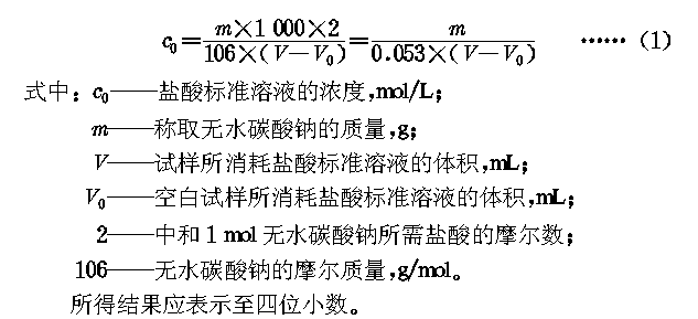 淡紫色,记录消耗盐酸标准溶液的体积,按式(1)计算盐酸标准溶液的浓度,标定结果需用双份试料取其平均值,同时做空白实验。 公式