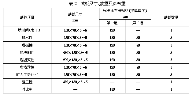 试验方法 5.1 涂料取样按GB3186的规定进行。 5.2 试验条件按GB/T9278的规定进行。 5.2.1 底板处理本标准中所用试板的底板除对比率使用聚酯膜(或黑白卡片纸)外,均应符合JG/T412—1991中3.2(厚度为3~5mm)的石棉水泥平板,其表面处理按JG/T23中的规定进行。 5.2.2 试板制备与养护试板的制备按照JG/T23规定进行,试板尺寸、数量及涂布量按 表2 规定进行。试板的养护时间除对比率试验外,试板均在5.2试验条件下养护21d。 5.3 容器中的状态涂料经搅拌后应无结块,呈均匀状态。 5.4 施工性用刷子在底板表面刷涂试样,涂布量为湿膜厚约120μm,使试板的长边呈水平方向,短边与水平面成约85°角竖放置,放置6h后再用同样方法涂刷第二道试样,在第二道涂刷时,刷子运行无困难,则可判为“涂刷二道无障碍”。 5.5 涂膜外观将5.4试验结束后的试板放置24h,观察涂膜,若无针孔和流挂,涂膜均匀,与协议标准颜色相比色差在允许范围内,则可判为“涂膜外观正常”。 5.6 低温贮存稳定性将涂料试样装入1L的塑料或玻璃容器(高约130mm直径约110mm壁厚0.23~0.27mm)内至约110mm高度处,密封后放入-5℃±2℃的低温箱内,保持18h后从低温箱内取出装试样容器,在标准条件下放置6h,按此操作三次后,打开容器盖,观察试样(允许分层)并轻轻搅拌,试样无结块、凝聚现象为合格。 5.7 热贮存稳定性将涂料装入与5.6相同的容器内,至110mm高度处,密封后放入50℃±2℃的恒温箱内,保持30d后从恒温内取出装试样容器,打开容器盖,观察试样(允许分层)并轻轻搅拌,试样无结块、凝聚、霉变现象为合格。 5.8 表干时间按GB/T1728乙法规定进行。 5.9 对比率 5.9.1 涂膜制备在透明聚酯薄膜上或者底色黑白各半的卡片纸(符合GB/T9270—1988中4.3规定)上按JG/T23—2001中5.1线棒涂布法进行,并在5.2规定条件下至少放置2h。 5.9.2 用反射率测定仪测定涂膜在黑白卡片纸底面上的反射率。 5.9.3 如用聚酯薄膜为底材制备涂膜,则将涂漆聚酯贴在滴有几滴200号溶剂油的仪器所附的黑白玻璃标准板上,使之保证光学接触,然后在至少五个位置上测量每张涂漆聚酯膜的反射率,并分别计算平均反射率(R B 黑板上和R W 白板上)。 5.9.4 如用底色为黑色各半的卡片纸制备涂膜,则直接在黑白底色涂膜上至少五个位置测量反射率,并分别计算平均反射率RB(黑板上)和RW(白板上)。 5.9.5 对比率计算对比率%=R B /R W ×% 5.9.6 黑白玻璃标准板和黑白卡纸的反射率为: 黑色:不大于1%;白色:(80±2)% 5.9.7 仲裁检验 用聚酯膜法结果评定应符合表1技术指标。 5.10 耐水性按 GB/T1733—1993甲法规定进行。浸于GB/T6682—1992规定的三级水中,如三块试板中有二块试板无起泡、裂纹及剥落,允许有轻微掉粉,判定为合格。 5.11 耐碱性按 GB/T9265的规定进行,三块试板中有二块无起泡、裂纹及剥落,允许有轻微掉粉,判定为合格。 5.12 耐温变性 按 JG/T25规定进行。三块试板中应有二块试板无起泡、裂纹、剥落,允许轻微掉粉,判定为合格。 5.13 耐洗刷性按GB/T9266规定进行。 5.14 耐人工老化 性按GB/T1865规定进行,结果评定按GB/T1766进行,应符合表1技术指标。 5.15 耐沾污性 试验方法见附录A(标准的附录),结果评定应符合表1技术指标。